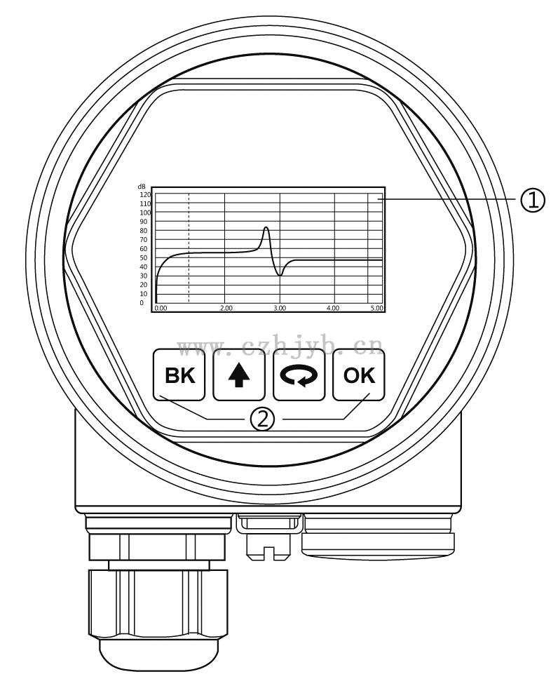 在進(jìn)入電氣接口前,將電纜向下彎曲,以確保水不會(huì)流入殼體,見(jiàn)①