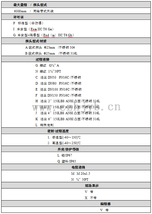 本產(chǎn)品的防爆形式為本質(zhì)安全型。防爆標(biāo)志:Exia IIC T6。本安型導(dǎo)波雷達(dá)物位計(jì)采用壓鑄鋁外殼材料,電子部件采用膠封 結(jié)構(gòu),從而確保電路部分故障時產(chǎn)生的火花不會泄放出來。本產(chǎn)品適用于Exia IIC T6 防爆等級以下可燃性介質(zhì)的物位連續(xù)測量。