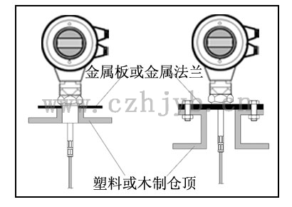 無論是纜式或桿式若想儀表工作正常,過程連接表面應為金屬。當儀表裝在塑料罐上時,若罐頂也是塑料或其它非導電材質時,儀表需要配金屬法蘭,若采用螺紋連接,需配一塊金屬板。